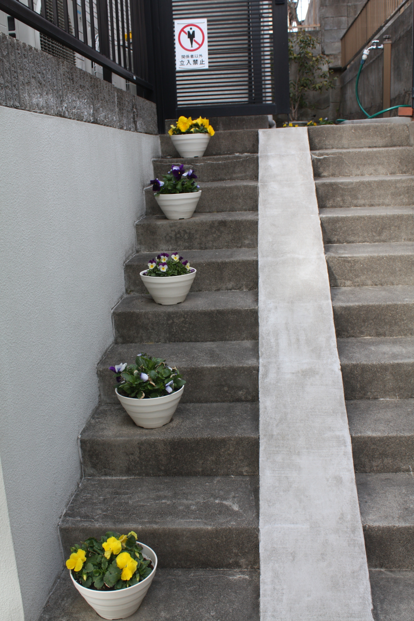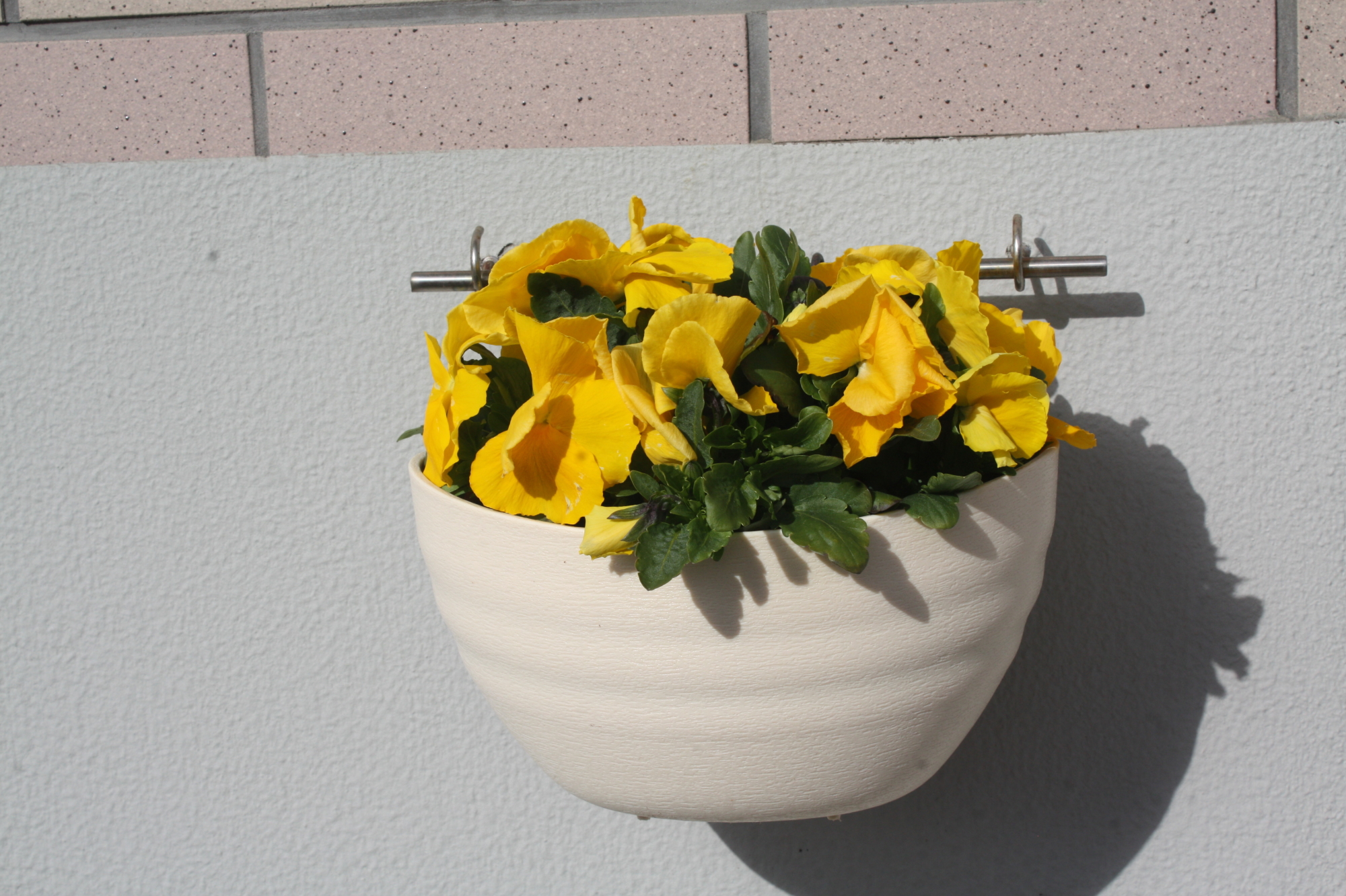 積雪、2週間ほど前に植えたパンジーがめんこく、黄色い花は、元